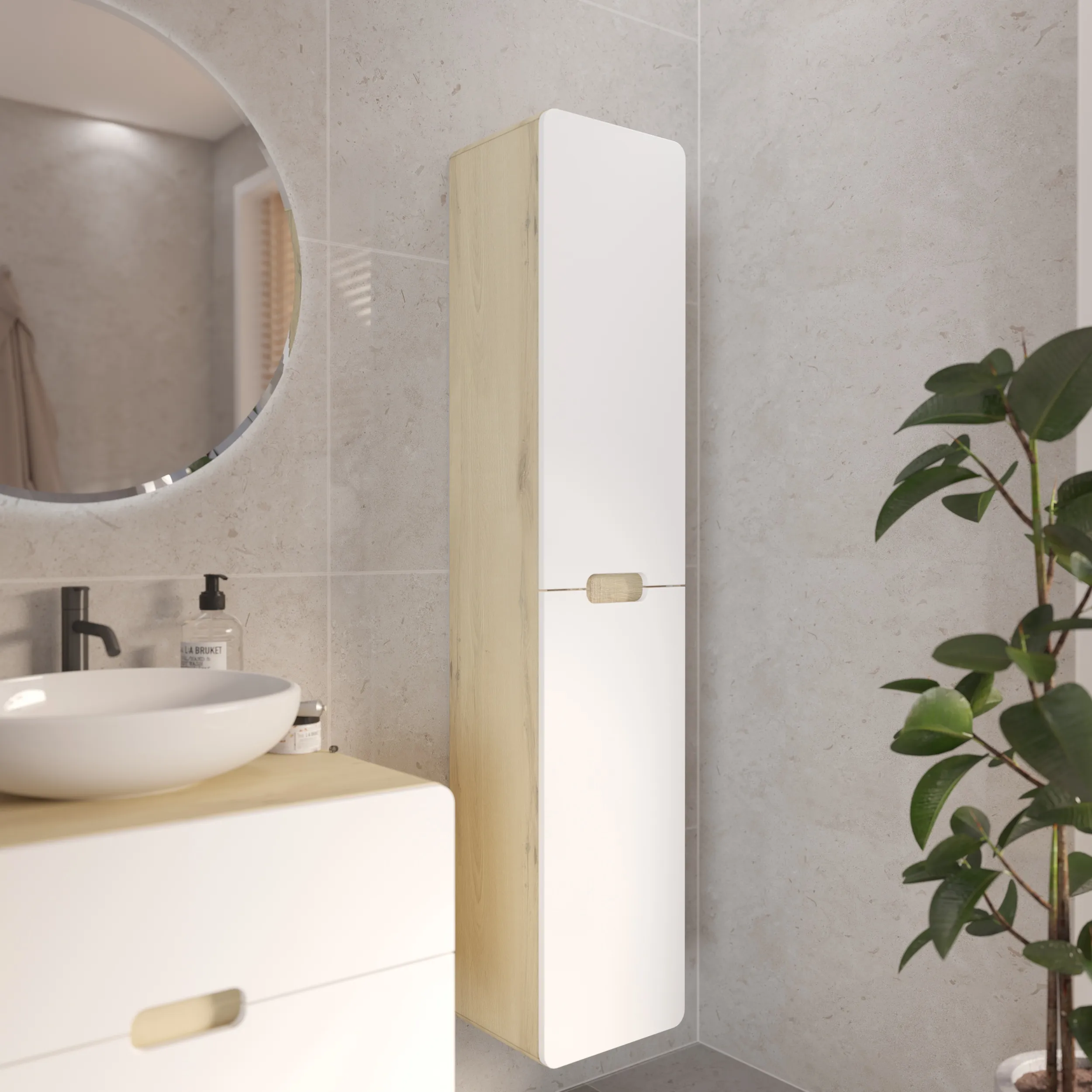 Подвесной пенал Vortex – современное минималистичное решение для хранения в ванной. Плавные скругленные края, белый фасад с древесным корпусом символизируют гармонию, создают ощущение легкости и безопасности. Это особенно актуально в ванной комнате, где важно чувствовать себя комфортно и расслабленно.Характеристики: