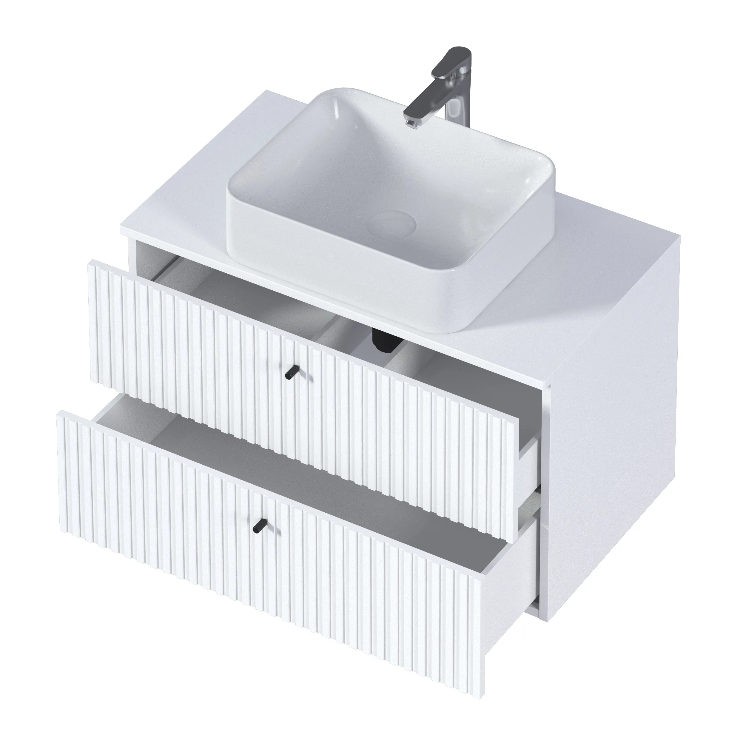 Тумба Desire – изящное решение для интерьера ванной комнаты. Рельефный фасад создает ритмичную игру света и теней. Черные ручки-кнопки контрастируют с белым фасадом и подчеркивают её современный дизайн.Характеристики: