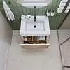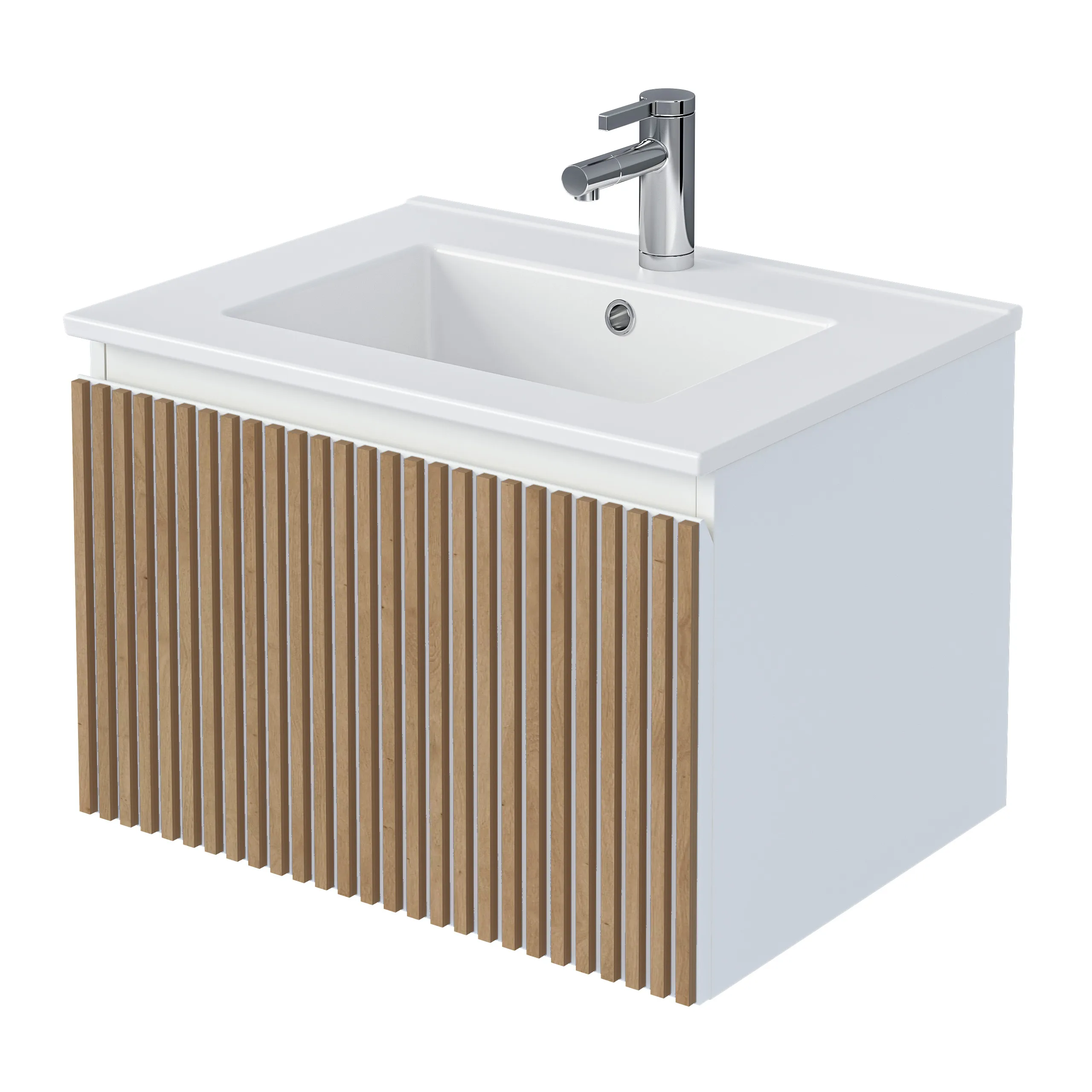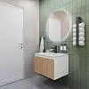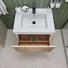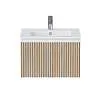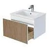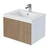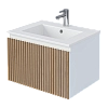 Тумба под раковину* Row - утонченная роскошь в ванной комнате. Белоснежный корпус и фасад из МДФ, покрытые матовой итальянской эмалью, создают благородный и элегантный вид. Декоративные рейки из шпона на фасаде добавляют уникальную текстуру и глубину, делая тумбу арт-объектом. Один вместительный ящик с плавными доводчиками гарантирует комфортное использование, хранение необходимых ванных принадлежностей, а подвесная конструкция визуально расширяет пространство и облегчает уборку.Характеристики: