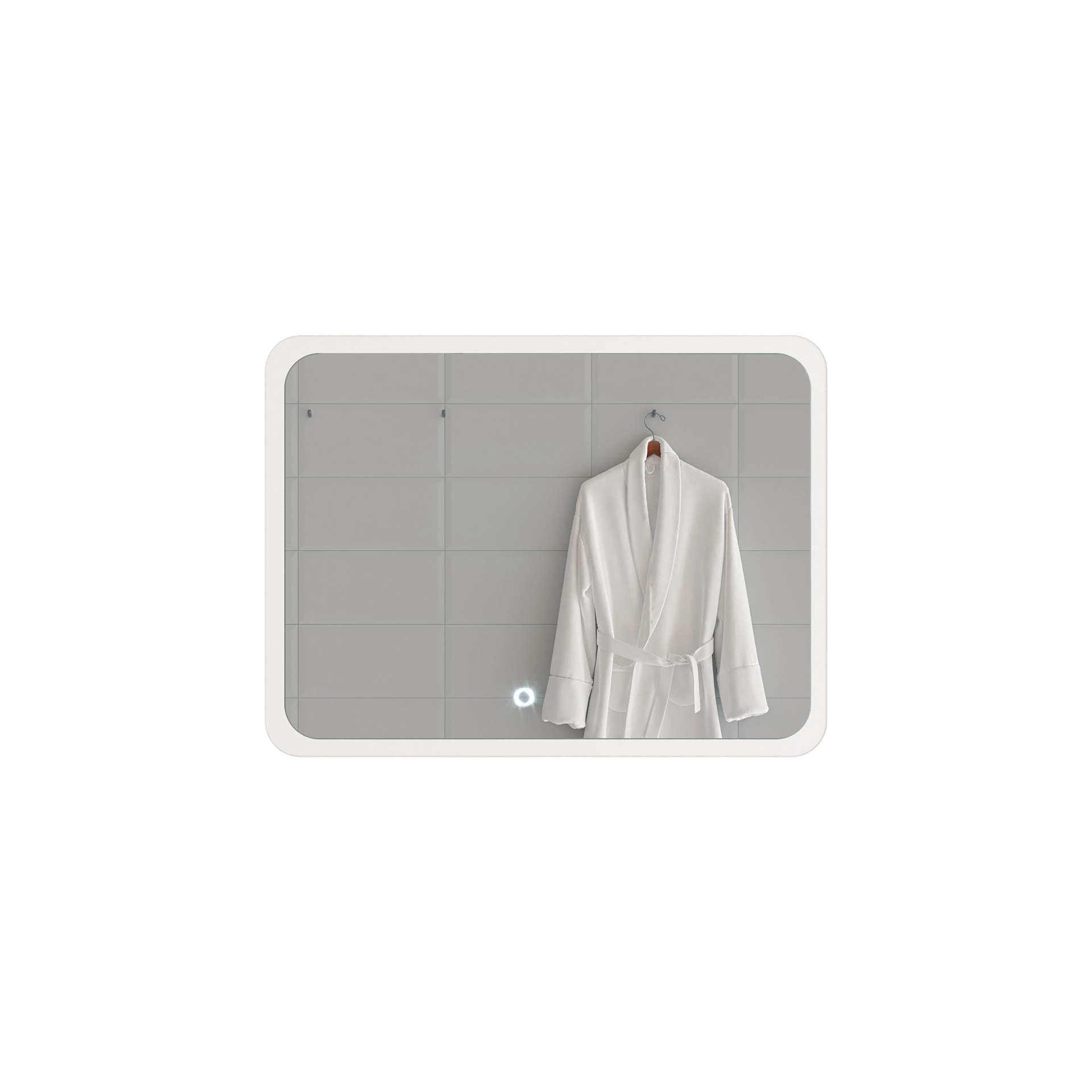 Невесомое, стильное, идеально подходящее практически для любой ванной комнаты, это зеркало сочетает в себе классический дизайн с современных технологиями, которые превращают его в функциональный технологичный объект. Зеркало имеет универсальную прямоугольную форму с мягкими краями, а также оснащено подсветкой, которой легко управлять с помощью выведенной на лицевую панель кнопки. Приглушенный белый свет, излучаемый зеркалом по всему периметру, мягко и деликатно освещает ванную комнату, создавая  в ней особенно уютную атмосферу, которая прекрасно располагает к расслабляющим процедурам.